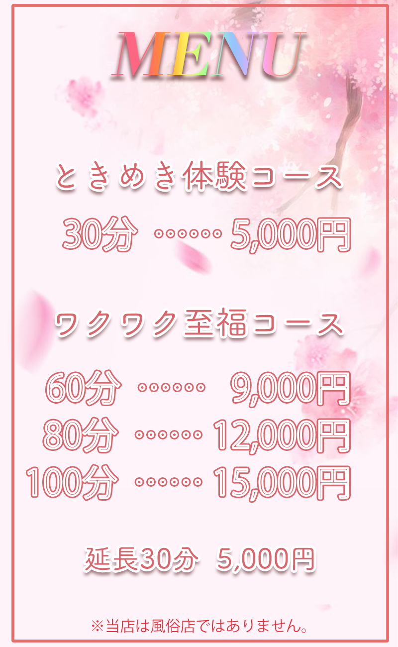 毎日頑張っている紳士の皆様、日頃の疲れになっている身体と心を、幸福なる雰囲気包まれた癒しの場所、落ちついた部屋の個室で可愛いセラピスト達がお待ちしております。当店のセラピストは若く容姿端麗にこだわりました、まるで蜜のように甘く幸せな空間でゆったりとした時間をお過ごし下さい。